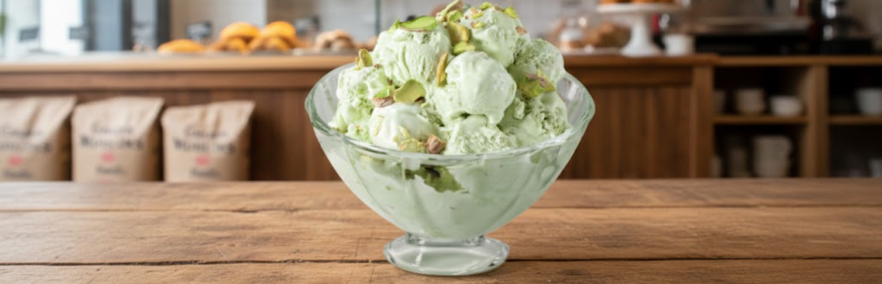 1. Peser et mélanger les éléments secs ensemble2. Débuter la pasteurisationTiédir le lait à 45°C3. Ajouter ensuite la pâte de pistache, mixer de nouveauPâte de pistache4. Pasteuriser à 85°C5. Refroidir rapidement à 4°C, mixer et maturer 12 à 24H6. Mixer et turbiner