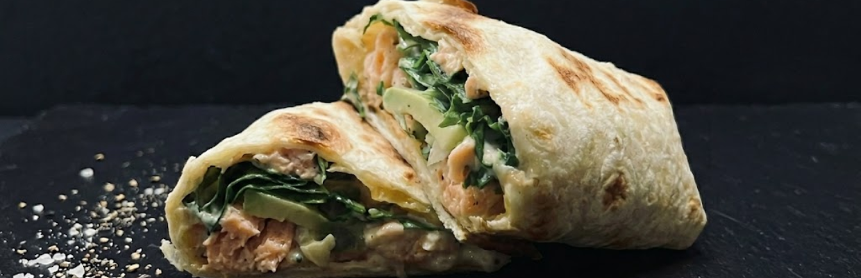 Wrap au saumon frais et fromage fondu, cuit au four Mychef, garni de roquette, oignon frit et sauce yaourt pour une offre snacking chaude et gourmande.